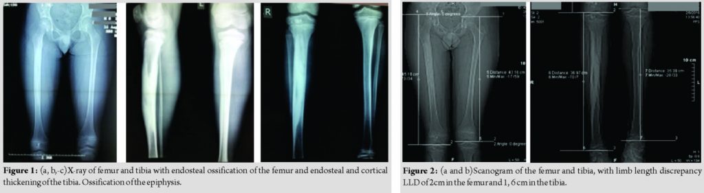 On X-ray examination of his legs, femur and tibia on the right leg had longitudinal diffuse hyperostosis, affecting the medullary canal. There was endosteal and cortical irregular thickening mainly of the tibia. There were irregular areas of ossification in the epiphysis of the femur and tibia. Endosteal ossification was present on the talus of the same foot. Growth plates were open and normal both for femur and tibia. Soft tissue was normal, with no signs of heterotopic ossification. Laboratory investigations including serum alkaline phosphatase, Ca, and P were within normal limits. We performed a scanogram that measured his discrepancy as 2 cm in the femur and 1, 6 cm in the tibia.