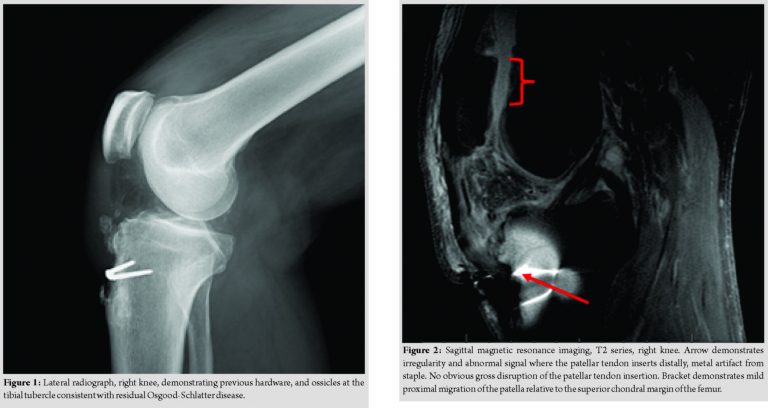 Conclusion: Surgical intervention for Osgood-Schlatter disease can be a potential risk factor for patellar tendon rupture from the tibial tubercle. Since a variety of surgical interventions for symptomatic Osgood-Schlatter disease exist, it is important to consider the long-term effects and counsel patients on the associated risks of the procedures. Initial diagnosis of patellar tendon rupture can be surprisingly challenging when the presentation is atypical. Attention to detail during physical examination and evaluation of imaging is a necessity for early detection and treatment, which can afford excellent functional outcomes.