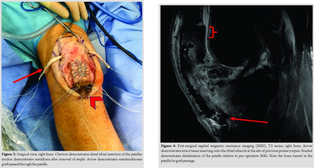 A history of previous surgery may compromise patellar tendon quality making it unsuitable for primary repair. In this occurrence, a primary rupture of a previously compromised tendon can mimic a chronic patellar tendon rupture. Primary repair alone is not indicated for chronic patellar tendon rupture because of superior patellar migration, poor tissue quality of the remaining tendon, bone atrophy of the patella, and tissue scarring [1,3]. In chronic instances, tendon augmentation can be utilized to strengthen the construct and allows for earlier functional rehabilitation and range of motion exercise [4].