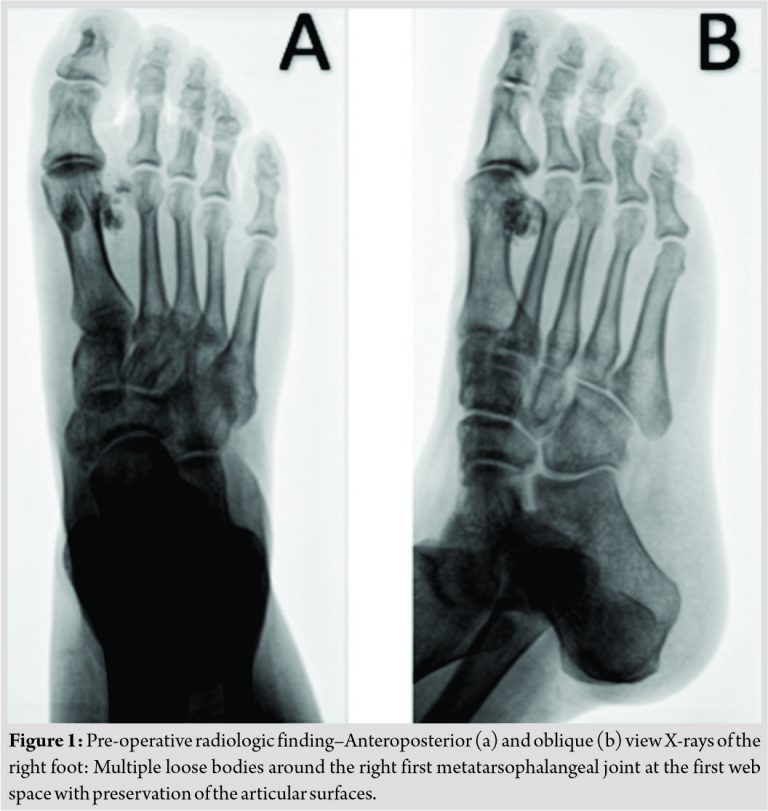 - 14. Ryan JD, Garwood C, Lickiss J. Synovial chondromatosis surrounding the first metatarsophalangeal joint: A case report. Foot Ankle Spec 2016;9:174-8. [Google Scholar]