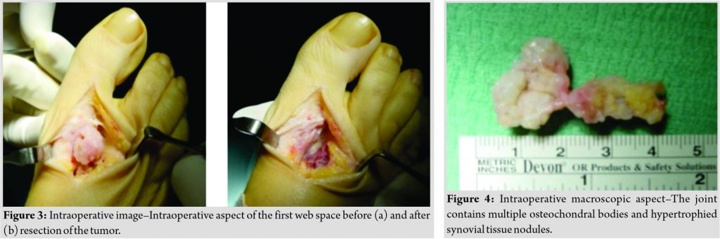 Coronal magnetic resonance (MR) imaging revealed multiple soft tissue masses, the largest one about 22×11mm in size with high signal on T1 in the first webspace. Small internal regions showed low signal on both T1 and T2. In view of the image study and the patient’s symptoms, surgical treatment was proposed. A complete resection of the bursa with all osteochondral bodies was performed under locoregional anesthesia (Fig. 3).