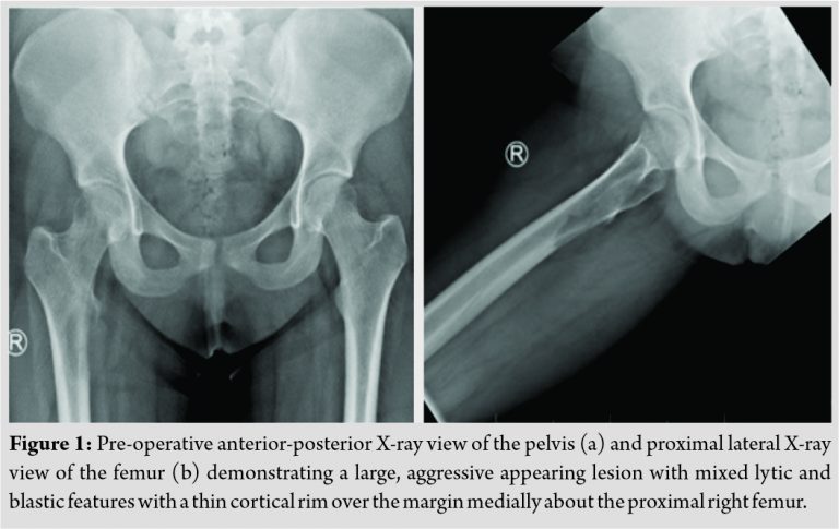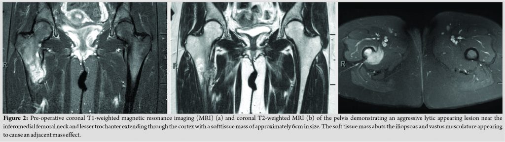 Radiographs were obtained by her primary care provider, which demonstrated a large, aggressive lesion with some mixed lytic and blastic features about the proximal femur (Fig. 1). On careful examination, there appeared to be a thin cortical rim over the margin of the lesion medially. Magnetic resonance imaging was obtained and demonstrated an aggressive appearing lesion centered near the inferomedial femoral neck as well as the lesser trochanter (Fig. 2). The lesion demonstrated a lytic appearance with some extension through the cortex. A soft tissue mass of approximately 6cm in size was present which abutted the iliopsoas and vastus musculature causing adjacent mass effect.