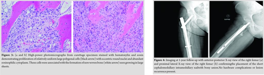 The patient underwent an open biopsy of the lesion through a posterolateral approach to the proximal femur. Sections from the curettage specimen showed a proliferation of relatively uniform large polygonal cells with eccentric round nuclei and abundant eosinophilic cytoplasm (Fig. 3). These cells were associated with the formation of new woven bone and seen growing in large sheets. By immunohistochemistry, the cells showed diffuse positive staining for SATB2, consistent with osteoblastic differentiation. Tumor necrosis was not present and mitotic activity was low (1–3 mitotic figures per 10 high-power fields). Overall, the morphologic features were consistent with an epithelioid osteoblastoma. After a diagnosis of epithelioid osteoblastoma was established, the patient returned to the operating room for extensive curettage of the lesion through a posterolateral approach followed by insertion of a short cephalomedullary intramedullary nail. Before insertion of the nail, an argon beam was used to ablate the curettage bony and soft tissue margin. Following insertion of the nail, the defect was then filled with allograft cancellous bone as well as demineralized bone matrix and the wound was then closed. The patient was made partial weight-bearing for a period of 6 weeks followed by full weight-bearing. Her pain was reported to be significantly relieved at the 6-week post-operative visit and she was ambulating with a mildly antalgic gait. One year post-operative imaging did not reveal any hardware complications or lesion recurrence (Fig. 4). In addition, on examination at the 1-year post-operative follow-up,the patient was not limited in gait or function. We will continue to follow the patient with serial radiographs and physical examinations for years to evaluate for recurrence.