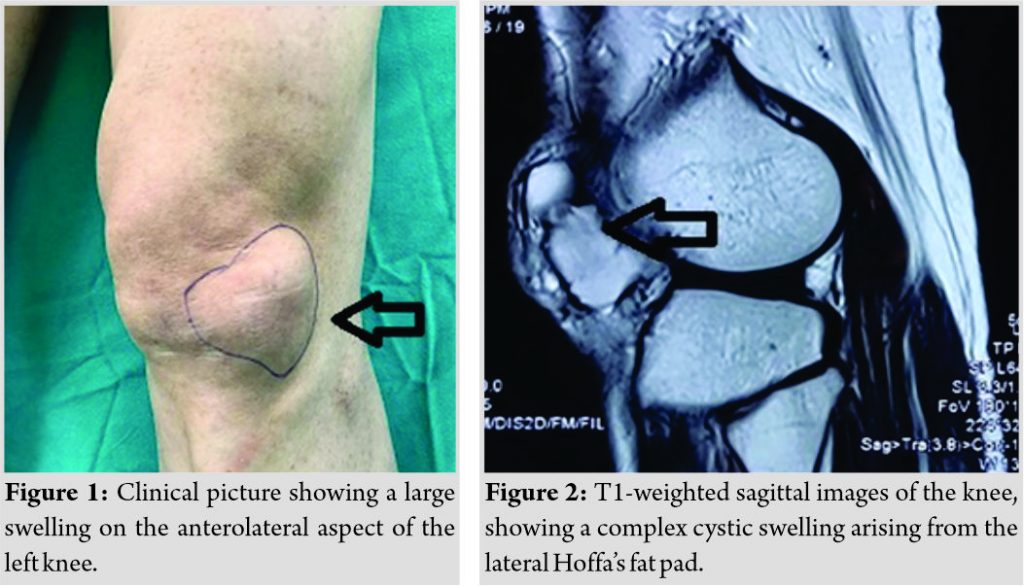Introduction: The ganglion cysts are benign fluid-filled sacs, which often arise from a tendon sheath or a joint capsule. Their origin from the fat pad of the knee is rare. Several studies have described intra-articular ganglion cysts in detail; however, extra-articular soft-tissue ganglion cysts have been reported sparingly. We report a rare case of giant ganglion cyst arising from lateral Hoffa’s fat pad (HFP).