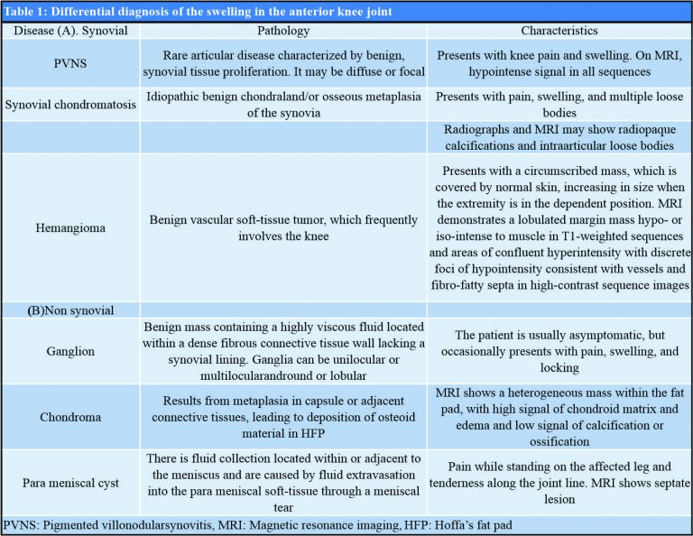 The infrapatellar fat pad (IFP) is also known as HFP. These are intracapsular, but extra synovial structures fill the anterior compartment of the knee. These are richly vascularized and innervated structures. The exact function of these HFP is not known. However, some studies have indicated that these may play a role in the biomechanics of the knee or act as a store for reparative cells after the injury. The HPF of the knee may be affected by a variety of tumors and tumor-like conditions [5]. These include ganglion, localized PVNS, parameniscal cyst, synovial cyst, and chondroma. The differential diagnosis of these similar-looking lesions may be difficult (Table 1), and hence awareness about these entities is crucial in making a right and prompt diagnosis.