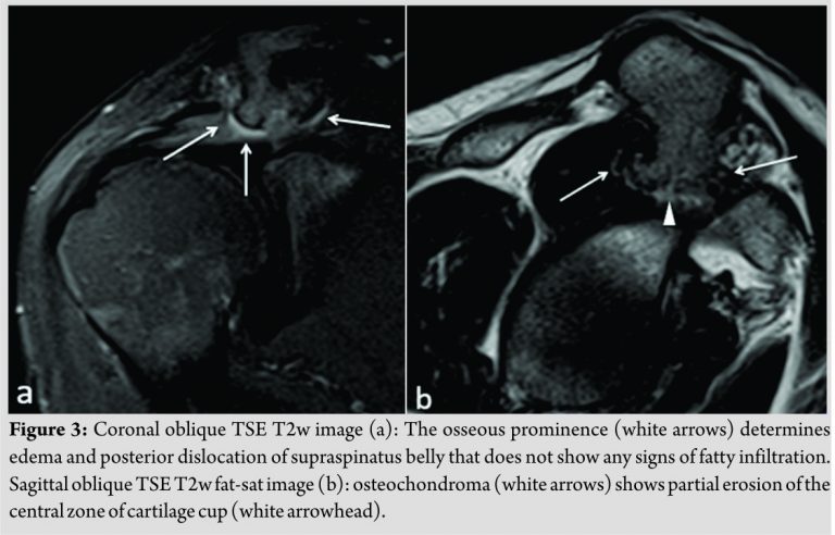 Plain radiography of the shoulder shows a bony prominence protruded inferiorly from the undersurface of the clavicle with the reduction of subacromial sliding space (Fig.1). Computed tomography images better show osseous prominence near acromioclavicular joint with the cortical connection. This lesion has a maximum diameter on the coronary plane of 22 mm and on the sagittal plane of 26 mm with cortical implant of 9 mm (Fig.2). Magnetic resonance imaging examination revealed the cartilage cap of the exostosis which, at the center zone, shows irregular continuous solution extended to the underlying subchondral bone (Fig.3a). The osteochondroma compressed and displaced posteriorly the supraspinatusmuscular belly that shows edema but preserve sregulartropism (Fig.3b).