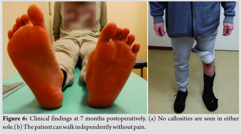 Eight weeks after the final fixation, we allowed the patient to walk, with partial weight-bearing, while wearing a rocker bottom shoe. Fullweightbearing gait was initiated 4 months post-surgery. Presently, he can walk independently withoutpain, and there are no callosities in either sole (Fig. 6a and b). He was able to return to work 1 year after the injury and 2 years after the final operation, all screws were removed. He reported a high level of satisfaction. Regarding his ankle range of motion, plantarflexion was 15°, dorsiflexion was 0°, and the lower extremity functional scale score was 51 points at the time of return to work. On the radiograph, the M1-M5 angle was 22°, and the calcaneal pitch angle was 0°.Three years after the final fixation, when we performed the final follow-up examination, the sole sense was maintained, ankle plantarflexion was 20°, and dorsiflexion was 0°. At the same time point, on the radiograph, bone fusion was complete and no notable complications were observed (Fig. 7).