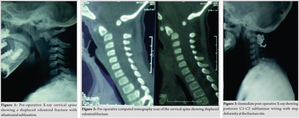 A 2-year-old female child was brought to our tertiary care center with alleged history of road traffic accident followed by complaint of inability to hold the neck upright. She had to support her chin with her wrists. Examination revealed restricted neck range of movements with tenderness at the craniocervical junction. Her neurological examination was normal with normal tone maintained in all the four extremities. Radiographs (Fig. 1) and computed tomography (CT) scan of the cervical spine (Fig. 2) revealed a displaced fracture of the odontoid synchondrosis with anterior subluxation of C1 over C2 vertebra.The patient was immobilized with a Philadelphia collar. In view of significant displacement of the odontoid with associated atlantoaxial subluxation, adecision was taken to perform reduction and posterior atlantoaxial fusion using sublaminar wiring. The procedure was performed through a posterior approach. Sublaminar wires were passed under C1 posterior arch and C2 lamina, and reduction was done under fluoroscopy guidance. A small diameter mesh cage filled with hydroxyapatite crystals was placed between the C1 posterior arch and the C2 lamina to maintain C1-C2 vertebral alignment and aid fusion. Surgery was carried out without any complications and postoperatively, she was maintained in Philadelphia collar for a period of 8 weeks. The post-operative period was uneventful. Her immediate post-operative radiography revealed a step deformity with angulation at the fracture site (Fig. 3).