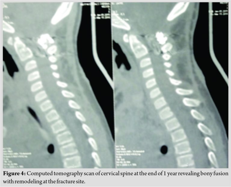 At a 1-year follow-up, CT scan of the cervical spine revealed excellent remodeling at the fracture site with bony posterior fusion at C1-C2 (Fig. 4). She had terminal limitation of rotations of the neck, but sagittal alignment was satisfactory.