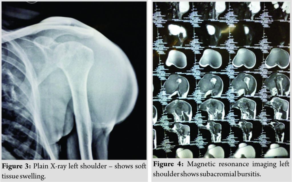Conclusion: Massive subacromial bursitis is rarely reported in medical literature. Even if swelling is massive, the benign lesion must be considered as a differential diagnosis of swelling around shoulder joint.