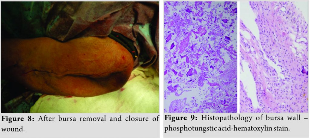 Neither Gram-positive nor Gram-negative organisms were grown in culture. Mycobacterium culture was also negative in the bursal contents. Histologically, the bursal membrane showed thickening which was assumed to be due to chronic inflammation, but no villous hypertrophy (Fig. 9). Since the synovial surface was stained with the phosphotungstic acid-hematoxylin stain (PTAH), depositions of fibrin were indicated. The intrabursal substance showed amorphous tissue which was almost entirely stained with PTAH, but few cells were observed anywhere. The alkaline Congo red methods showed no staining. Thus, we concluded that the substance was a thick collection of fibrin.