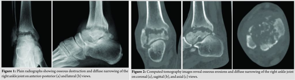 A 55-year-old man presented to our university hospital complaining of general fatigue for the past several months. 13 years earlier, he had undergone aorta valve replacement at our hospital for severe aortic regurgitation caused by infective endocarditis with aortic valve vegetations and had been receiving oral warfarin as an anticoagulant since that time. He was 167 cm tall, weighed 60 kg, and had a body mass index of 21.7. Laboratory investigations revealed severe anemia with hemoglobin of 4.4 g/dL, so he was admitted to the internal medicine department of our hospital for blood transfusion. He also reported a 5-year history of untreated right ankle pain that had worsened in the previous month. During this hospitalization, he was referred to our department for the assessment of the right ankle pain. On physical examination, there were tenderness, local warmth, and redness over the right ankle, especially on the anterior aspect, and range of motion at the ankle joint was limited to 0°of dorsiflexion and 5° of plantarflexion. Laboratory investigations revealed evidence of inflammation(white blood cell count 8600 cells/µL and C-reactiveprotein 8.44 mg/dL). Clinical examination showed no feature ssuggestive of congenital connective tissue disorder. Radiography and computed tomography images revealed osseous destruction and diffuse narrowing of the right ankle joint space (Fig. 1a and b and Fig. 2a, b, c).