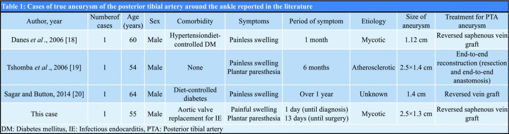 - 17. Murakami H, Izawa N, Miyahara S, Kadowaki T, Morimoto N, Morimoto Y, et al. A true aneurysm of posterior tibial artery. Ann Vasc Surg 2011;25:980.e1-2. [Google Scholar] [PubMed]