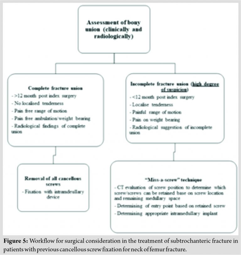Subtrochanteric fracture after previous cancellous screw fixation for NOF fracture is rare but difficult to manage complication that poses technical difficulties to the surgeon. Both intramedullary and extramedullary fixation techniques have been described with varying degrees of success. In a series by Howard et al., in 1982, 10 out of 408 patients developed subtrochanteric fracture after the two screws Garden technique [6] for the treatment of subcapital fracture. Six of those patients were treated with a McLaughlin pin and plate, the pin being substituted for one of the screws. However, the complication rate was high with 50% of patients developing a complication. In 1984, Mac Eachern et al. [7] described a method of fixation by substituting a Richards sliding screw of a corresponding angle for the lower cancellous screw which resulted in good union in all four patients treated. Similarly, Mackie and Leyshon [8] described a technique of replacing the lower cancellous screw with an AO dynamic hip screw and a five-hole plate in onepatient, resulting in satisfactory healing of both fractures. More recently, Jansen et al. [1] described a case series of two patients who underwent intramedullary nailing of the peri-implant subtrochanteric fracture which also led to a good outcome. At present, there are no standardized means of fixation and most literature is based on authors’ personal experiences. While we acknowledge that there are a multitude of possible fixation methods and considerations to take note, from fracture pattern, degree of NOF fracture union, to the specific previous placement of cancellous screws, we believe that a framework of management can be developed. We, therefore, propose a rational system of evaluating and managing such fractures as well as provide some technical insights to achieve good fixation (Fig. 5). In our protocol, we divide cases by previous NOF union after cancellous screw fixation. Previous union is of utmost importance as it dictates whether screw removal is possible while avoiding a disastrous scenario, in which there area concurrent iatrogenic NOF and subtrochanteric fracture. Union can be assessed clinically as well as radiologically [9]. Clinically relevant factors would include the duration since index surgery, the presence of hip pain on weight-bearing, ambulatory status, and concurrent medical comorbidities which might delay healing such as the presence of renal failure or osteoporosis. Radiological union is best evaluated through plain film and CT imaging [10]. Radiological imagining should be interpreted with caution in light of the metallic artifacts generated by the clustered cancellous screws insitu. A low index of suspicion should be adopted in the anticipation that femoral neck could be subjected to great stresses during the subsequent subtrochanteric surgery on a traction table or during reduction to overcome the strong muscular deforming forces acting at the subtrochanteric area. In the case of a completely united NOF fracture, simple implant removal should suffice with the subtrochanteric fracture treated as an isolated injury. In such circumstances, the authors recommend the placement of an intramedullary device as extramedullary devices (such as fixed angle blade plates or a sliding hip screw and plate) rely on fixation at the level of the femoral neck to resist the large amounts of laterally directed coronal and anterior/posterior sagittal plane stresses. The placement of the critical neck component resides within cancellous bone and therefore relies on cancellous impaction in normal bone to achieve stability [11]. However, as there are voids from the removal of large cancellous screws, this impaction of cancellous bone may be compromised. Intramedullary devices such as nails rely on the long lever arm passing inferiorly to resist the above stresses and are thus less affected. In the case of an incompletely united NOF fracture, strategies must be applied to retain the cancellous screws to maintain the reduction of the femoral neck. In this case, both extramedullary devices and intramedullary devices may be used. A careful analysis of the existing screws should be undertaken preoperatively. As previously described, the removal of the inferior-most screw and substitution with a dynamic hip screw has led to good results. However, it is the authors’ preference to treat subtrochanteric fractures with intramedullary devices in light of their biomechanical advantages mentioned above. A meta-analysis by Liu et al. [12] also found a significant lower rate of fracture fixation complication such as revision rate, fixation failure rate, and non-union rate with intramedullary fixation compared to extramedullary fixation for subtrochanteric fracture, especially in the elderly. In such cases, a “miss-a-screw” technique must be employed. The technical challenges can be analyzed with the proximal real estate and nail entry point in mind. First, a decision must be made on which screw(s) is/are retained. This is best evaluated on the sagittal cuts in a CT scan. Screws which are the most eccentric and whom allow the largest medullary fit should be retained and a measurement of the potential medullary canal diameter taken. Next the entry point should be evaluated, in the case of retaining anterior screws, a more posterior entry point should be selected and vice versa with retained posterior screws. By considering the natural bow of a femur, an intramedullary nail with an appropriate radius of curvature and proximal femoral fit can be selected.