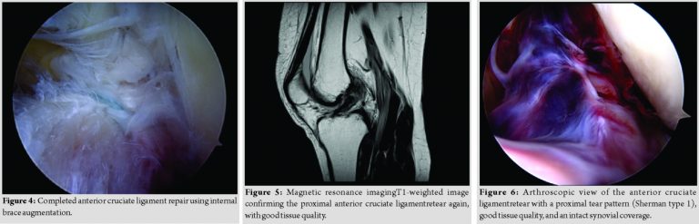 Conclusion: Arthroscopic ACL re-repair using internal brace augmentation is feasible and provides objective and subjective short-term clinical success as a revision surgery for primary ACL repair with internal brace augmentation. However, critical patient selection – including assessment of the ACL retear pattern and tissue quality – and prompt surgery are essential.