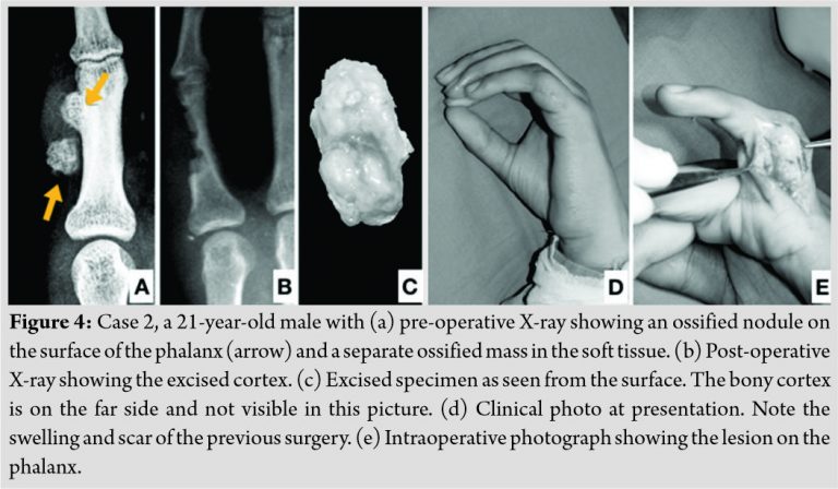 A 21-year-old male presented with a recurrent swelling of the left little finger for 4 months. He had undergone an excision biopsy at the same site 18 months ago in another institute. The biopsy slide reported outside as osteoma was reviewed and found to be BPOP. The patient gave no history of pain or trauma preceding the swelling. On examination (Fig. 4d), a firm, immobile, non-tender discreet swelling was felt on the anterolateral aspect of proximal phalanx of the left little finger. The overlying skin was free and showed scar of the previous surgery. There was no limitation of finger movement. All pre-operative investigations were normal. X-rays showed two bony projections in the proximal phalanx of the left little finger (Fig. 4a). The distal projection seemed to arise from the periosteum while the proximal lesion appeared separate from it. No periosteal or cortical thickening was seen with differential of periosteal osteogenic sarcoma(OGS)and BPOP in mind.