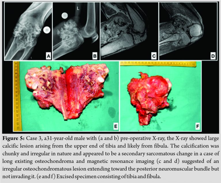 A 31-year-old male presented to the hospital with slow-growing swelling in the left proximal tibia for 7–8 years. The patient gave a history of fall 1–2 months before presentation and was unable to bear weight on the affected limb. On examination, a large mass was palpable arising from the proximal tibia extending posteriorly, laterally, and superiorly across the knee joint. Popliteal pulsation could not be felt, but dorsalis pedis was palpable and the patient had no neurological deficit. The patient had a fixed flexion deformity of 60° with no further range of motion possible at the knee joint. The X-ray showed large calcific lesion arising from the upper end of tibia and likely from fibula (Fig. 5a and b). The calcification was chunky and irregular in nature and appeared to be a secondary sarcomatous change in a case of long existing osteochondroma. The MRI suggested of an irregular osteochondromatous lesion extending toward the posterior neuromuscular bundle but not invading it (Fig. 5c and d). All pre-operative investigations were normal and a decision was taken to widely resect this tumor and implant a proximal tibia replacement megaprosthesis to allow limb salvage. A gross 13 cm long proximal tibial segment was resected and sent for intraoperative histological analysis. The tumor was lobulated with a cartilaginous cap and measured 10 cm×9cm×6 cm (Fig. 5e and f).