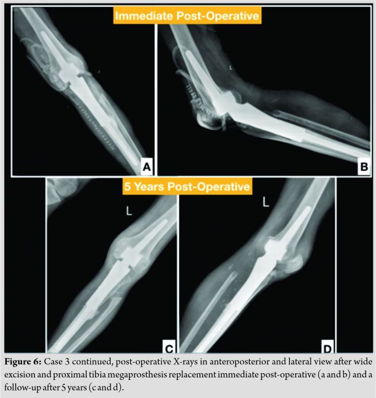 The tumor had eroded the posterior cortical margins. Also resected was a 4cm stump of proximal fibula which showed involvement intraoperatively. The histopathology revealed irregular mass of bony trabeculae with island of hyaline cartilage with extensive enchondral ossification. The newly ossified bone showed characteristic blue coloration in the intratrabecular space with no atypical cellular proliferation, thus confirming the diagnosis of BPOP. On regular post-operative follow-up, the patient recovered good quadriceps and hamstrings strength with knee range also recovering between 0 and 90°. No signs of recurrence were seen on a 7-year follow-up (Fig. 6.)