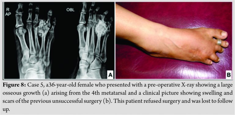 A 36-year-old female came with recurrent swelling of base of the 4th metatarsal for which she had undergone curettage at a local hospital (Fig. 8). The lesion was suspected to be an osteochondroma but recurred within 6 months of excision. Slides were reviewed by our histopathology department and the case was confirmed to be BPOP on histology. The patient, however, refused to undergo wide excision and was lost to follow up.