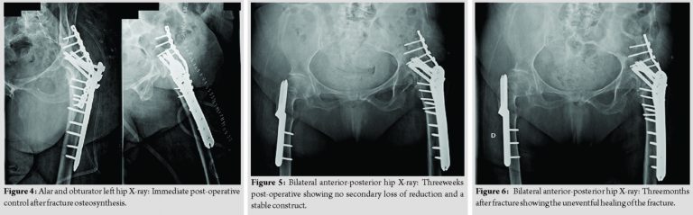 Conclusion: Without motion on the hip, the lower extremity forms one long lever arm, creating an unusual instability at the fracture site. The authors decided that, to overcome this situation, the construction had to be reinforced and extended from the iliac wing to the proximal femur with two plates. This provided enough strength and stability to allow an uneventful fracture healing. This approach can be easily reproduced and can be considered in future similar patients.