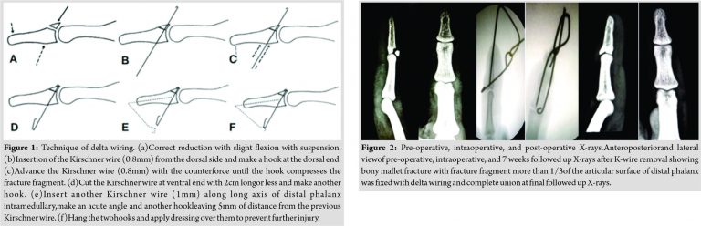 Conclusion: Delta wiring technique is a new and safe treatment modality for bony mallet fracture with fracture fragment involving more than one-third of the distal phalanx articular surface as satisfactory clinical and radiological outcomes obtained in our case.