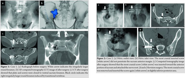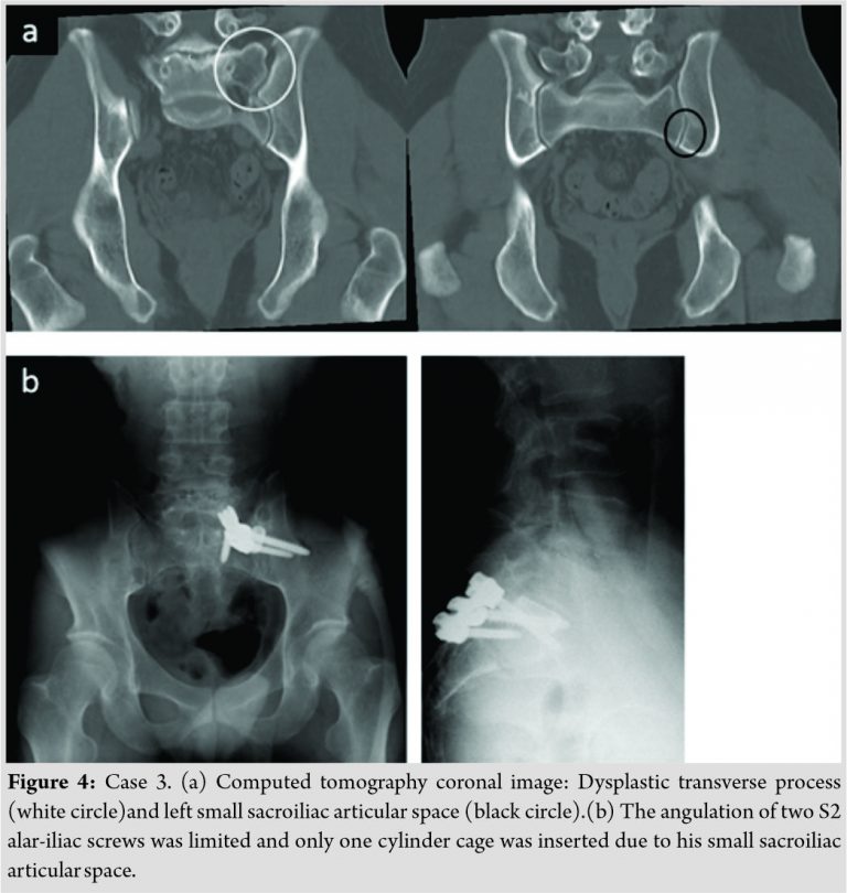 Case Report: For the cases of a 34-year-old man with LSTV Castellvi’s Type IV, anterior SIJ arthrodesis using a plate and screws was performed. The most cranial sacral foramen was larger and irregularly round, and the nerve root ran to the lateral side from the deformed foramen more than usual. A firm medial traction of the nerve root together with the psoas major muscle for the purpose of attaching a plate and inserting screws on the sacrum side could cause the temporary radiculopathy. For a 26-year-old woman with a thin sacral alar due to IIIb, SIJ arthrodesis using multi screws with the posterolateral approach was performed. The most cranial screw penetrated the anterior margin of the sacrum and caused nerve root injury. For a 35-year-old man with Ib, posterior SIJ arthrodesis was attempted using screws and cylinder cages. The insertion of the implants using the posterior approach was technically challenging due to the small size of the sacrum.