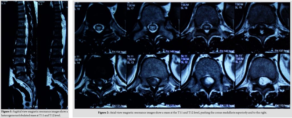 A 57-year-old female lady presented with complaint of sudden onset of urinary incontinence for 3 days duration. Further, history taking reveals that she has been having radiculopathy pain and bilateral lower limb weakness for a year duration. Clinical examination reveals that bilateral lower limb hypotonia, bilateral lower limb motor power of Medical Research Council (MRC) Grade 2, and bilateral lower limb reflexes were absent and sensory reduced from T11 dermatome onward. Magnetic resonance imaging reveals a heterogeneous lobulated mass in the spinal canal at T11 and T12 level, compressing and displacing the conus medullary superiorly and to the right (Fig. 1 and 2).