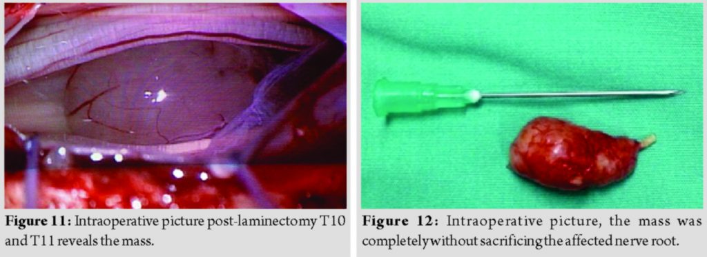 She underwent laminectomy of T10 and T11 with microscopic assisted excision of the tumor. The mass was successfully removed completely without sacrificing the involved nerve root (Fig. 11 and 12).