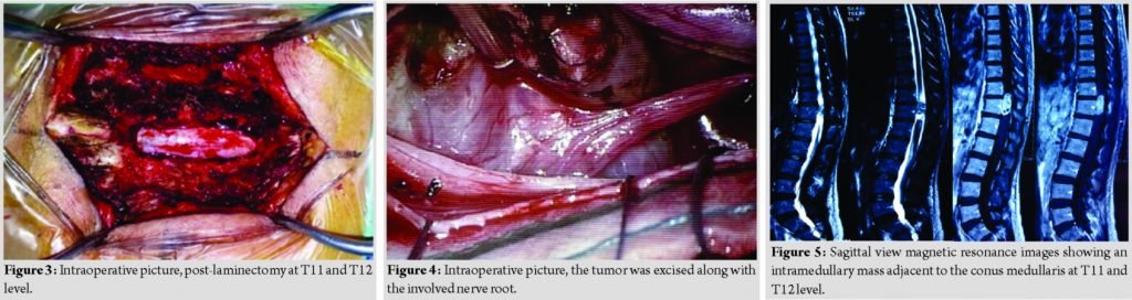 Case Report: In this case series, all three female patients in their 4th and 5th decades of life presented with conus medullaris syndrome. Lower back pain, radiculopathy, lower limb weakness, and urinary incontinence are their main clinical presentation. Magnetic resonance imaging shows a well-defined intradural, extramedullary mass compressing onto the conus medullary region. These patients undergone microscopic assisted excision of the tumor and had remarkably good early outcome despite the advanced presentation of neurological deficit.