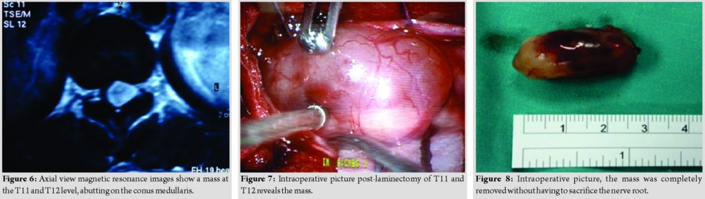 At post-operative day 1, the radiculopathy pain resolved. She regained bladder control at the 1st week post-operative. She was ambulating with aid at 2 weeks post-operative and by 2 months, she was able to walk unaided. There was no detectable post-operative neurological deficit despite sacrificing the involved nerve root. The final diagnosis was confirmed through histopathological examination.