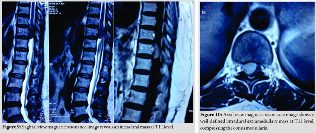 A 53-year-old lady presented with complaint of back pain and bilateral lower limb weakness for a year duration, associated with urinary incontinence for 2 months duration. Examination reveals normal tone, power over the right lower limb was more affected (MRC Grade 2) as compared to the left lower limb (MRC Grade 3), lower limb reflexes were brisk, and sensation was reduced from T11 dermatome onward. Magnetic resonance imaging reveals a well-defined intradural extramedullary mass at T11, compressing on the conus medullaris (Fig. 9 and 10).