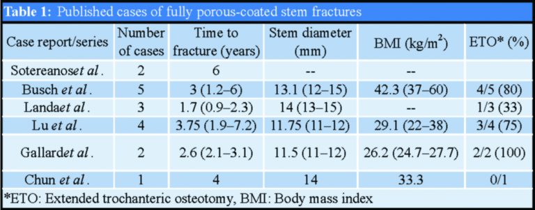 - 3. LandaJ, BenkeM, DayanA, PereiraG, DiCesare PE. Fracture of fully coated echelon femoral stems in revision total hip arthroplasty.J Arthroplasty2009;24:322.e13-8. [Google Scholar]