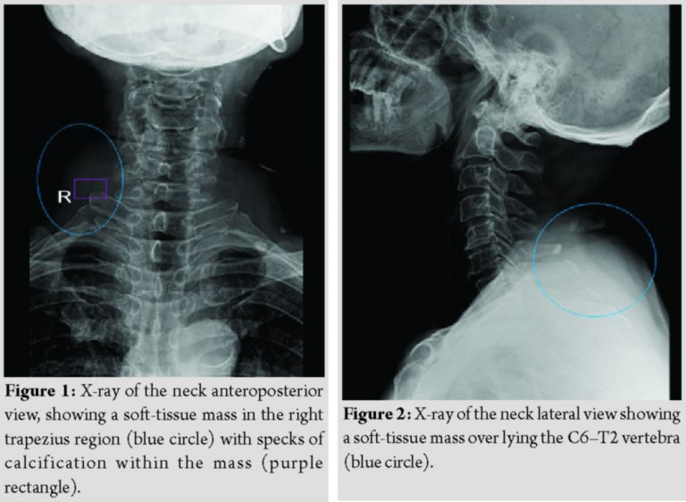 A 78-year-old gentleman, who was a farmer by occupation, currently retired, hailing from Tamil Nadu, presented with a 6-month history of a swelling over the right side of the neck. The swelling was gradual in onset, progressive in its size over the course of 6 months. The patient also developed dull aching pain over the swelling for the past 2 months.There were no radiation of the pain, associated weakness of the extremities, or any sensory deficits. There was no history of trauma in the recent past or any other constitutional symptoms.The patient is not a diabetic. He is a K/c/o hypertension, COPD, and BPH for which he has been on treatment. On examination, there was a globular swelling of size 10 × 8 cm which was palpable over the right shoulder. The mass was seen extending superiorly, 8 cm below the mastoid tip to until the spine of scapula, mediolaterally from the midline, up to the medial border of scapula. On palpation, there was no local warmth or tenderness, globular swelling was felt which was firm in consistency with well-defined margins. The skin over the swelling was pinchable. The swelling was mobile in the coronal plane. There was no associated weakness or sensory deficits in the right upper limb. Movements of the shoulder were also unaffected.
