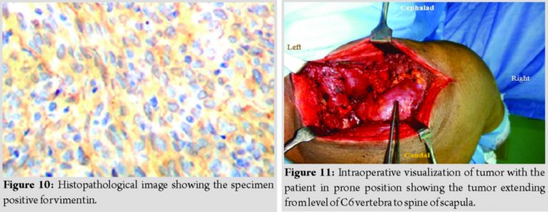 Open biopsy was done which showed benign spindle cell lesion infiltrating skeletal muscles, focal reactive skeletal bundle, with no necrosis, and no increase in mitosis. The tumor cells were positive for vimentin, focally positive for beta-catenin, and smooth muscle actin (SMA) (Fig. 9 and 10). The cells were negative for S100. Hence, the lesion was suggestive of fibromatosis.
