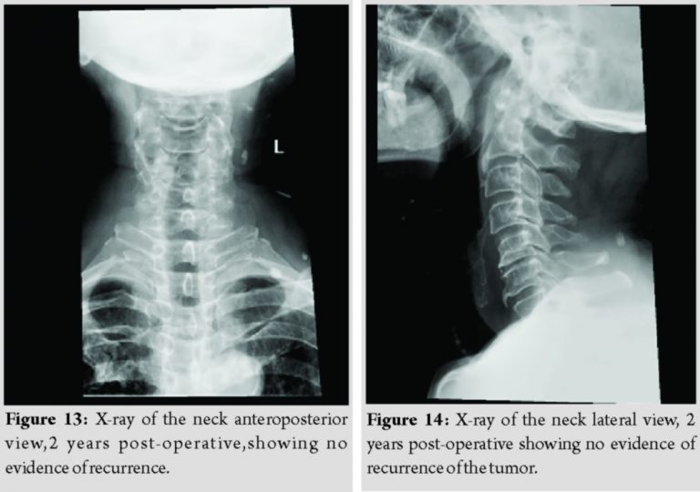 The post-operative period was uneventful and recovered completely. Power of the right upper limb and, movements of the shoulder are unaffected. The patient was started postoperatively on nonsteroidal anti-inflammatory drugs (NSAIDs) for a period of 1 month. The patient was not willing for radiotherapy and hence was deferred. He has been on regular follow-up for the past 2 years. There is no evidence of residual disease or recurrence of the tumor (Fig. 13 and 14).