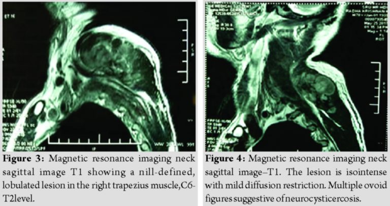 Conclusion: This case report is being presented to highlight the radiological differential of cysticercosis in a patient with muscular fibroma, extremely rare presentation of fibromatosis of the trapezius in the 7th decade.
