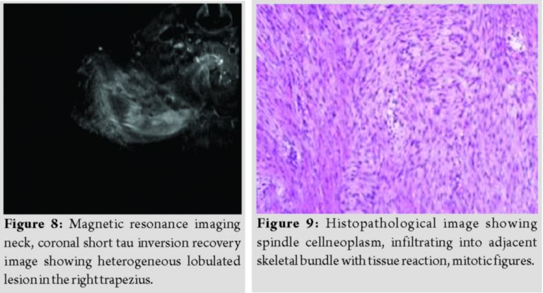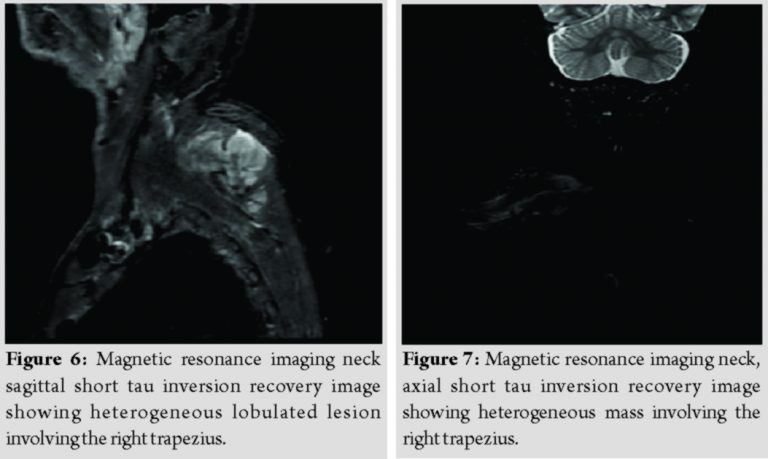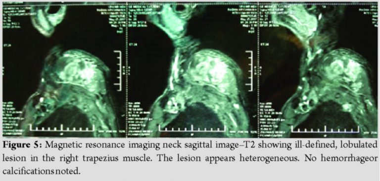 Fine-needle aspiration cytology was done, which was inconclusive. The patient was further planned for magnetic resonance imaging (MRI) of the neck, which showed an ill-defined, lobulated lesion measuring 4.0 x 7.0 x 5.4 cm, in the right trapezius muscle at C6-T2 level (Fig. 3).
