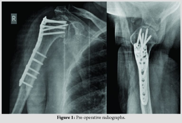 A 58-year-old female has sustained bilateral PHF in February 2018 due to electrocution. She was treated with ORIF with locking plate of both proximal humeri in a single stage. At 4-month follow-up, the left side fracture has united but on the right side, there was non-union with collapse of head and penetration of screw (Fig. 1). The patient is symptomatic with pain and inability to lift her right shoulder. The patient was advised computed tomography(CT) scan with 3D reconstruction of the right shoulder and nerve conduction studies to assess the deltoid function. After pre-operative evaluation, the patient was planned for reverse shoulder arthroplasty.