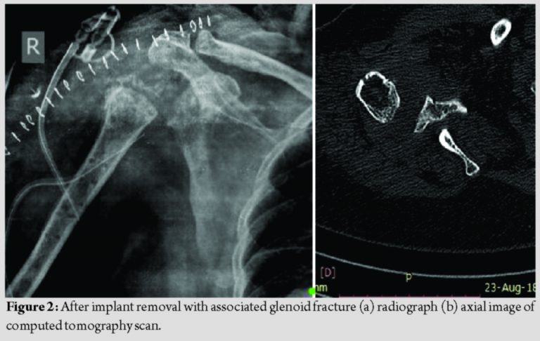 Under interscalene block, implant removal was done. There was posterior glenoid erosion due to screw penetration and glenoid was smaller than normal with a size of 2.7cm (superoinferior) × 1.72cm (anteroposterior). During drilling for the central peg, there was an iatrogenic glenoid fracture which was undisplaced. Due to the fracture, the procedure was abandoned, and we decided to treat the glenoid fracture conservatively with immobilization (Fig. 2). Reverse shoulder replacement was deferred till glenoid fracture union.