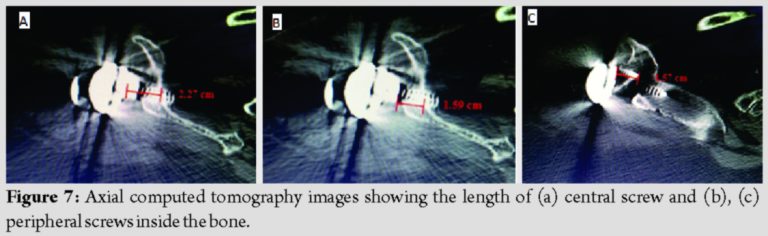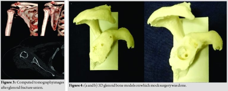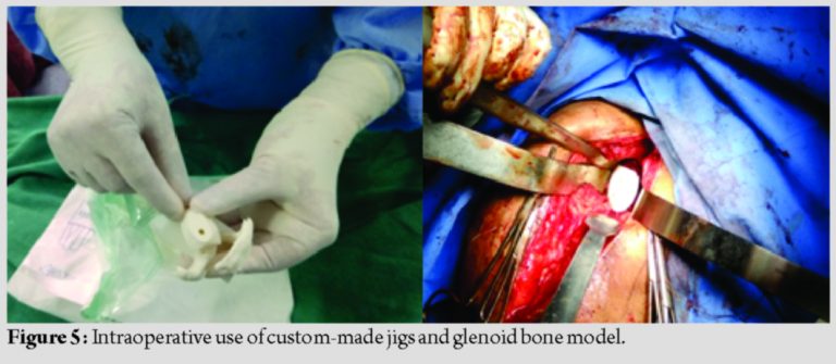 Conclusion: Reverse shoulder arthroplasty can be considered as a salvage procedure for failed fixation of PHF with predictable outcomes. Custom-made patient-specific 3D printed jigs in reverse shoulder arthroplasty are useful in assessing the position and direction of central peg in case of small glenoid and glenoid bone defects. 3D bone models are useful in implant selection also.