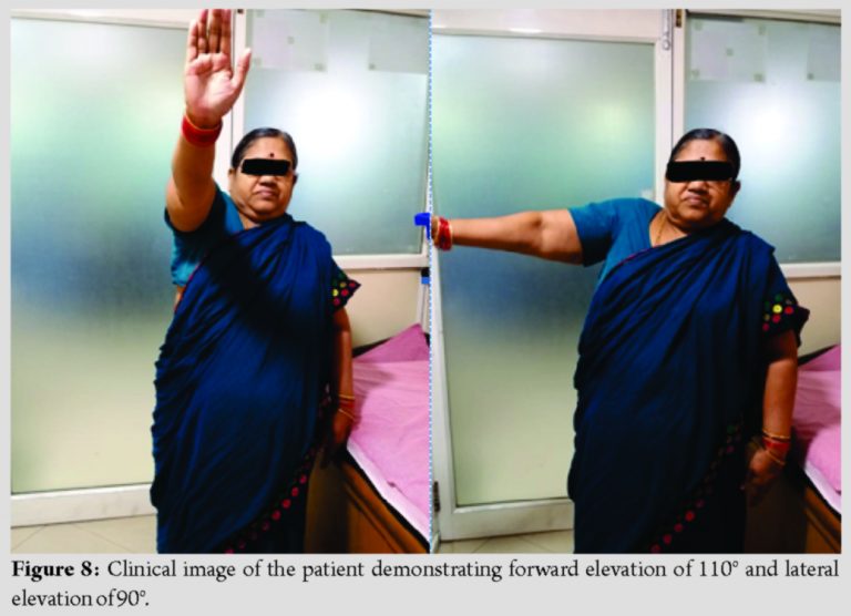 The stability and range of motion were assessed to be satisfactory intraoperatively. CT scan with 3D reconstruction was done in immediate post-operative period and at 3-month follow-up. It is found that 2.27 cm length of the central screw (Fig. 7a), and 1.57 cm and 1.59 cm length of the two peripheral screws (Fig. 7b, 7c) were inside the glenoid vault and are in the exact position as desired. On regular follow-up, the patient has a stable shoulder with active forward elevation of 110°, lateral elevation of 90°, and an external rotation of 10° at 1-year follow-up (Fig. 8).
