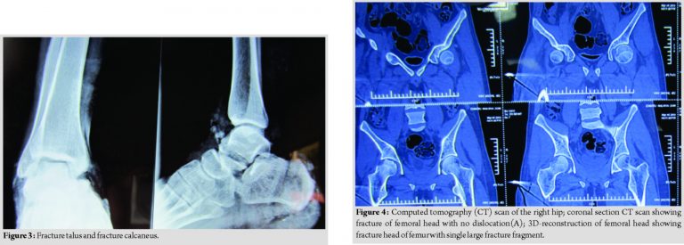 Radiographs done after primary resuscitation as per the standard protocol of advanced trauma life support. Radiographs revealed a fracture at the femoral head (Fig. 1), comminuted fracture Shaft of the mid femur, fracture of lower pole patella, posterior cruciate ligament avulsion with subluxation of the knee joint (Fig. 2), fracture talus, and fracture calcaneus (Fig. 3). There was no dislocation of the hip. Emergent ankle debridement was performed with stabilization of knee by upper tibial pin traction. A computed tomography scan of the right hip joint was done, which was suggestive of the femoral head fracture without dislocation or acetabular fracture (Fig. 4).