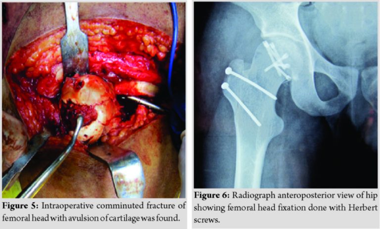 Femoral head fixation was performed after the fixation of fracture shaft femur by safe surgical dislocation of the hip approach. Intraoperative comminuted fracture of the femoral head(modified Pipkins type A-V) with avulsion of cartilage was found [5] (Fig. 5). The femoral head was approached by the method of safe surgical dislocation of the hip and fixation done with Herbert screws (Fig. 6).