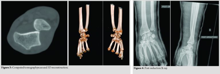 Mobility in flexion-extension was preserved. Pronation and supination were blocked and painful. The patient did not have a neurovascular deficit. Edema helped diagnosis. The ulnar head, palpable, was prominent in volar side. Diagnosis was supposed on the AP wrist and lateral views (Fig. 2) and confirmed with a computed tomography (CT)scan (Fig. 3). A radiological series including forearm and elbow X-rays confirmed the isolated character of the lesion. The patient was managed in the operating room under general anesthesia. Reduction by a closed manipulation was performed. In forced pronation, the operator maintained volar pressure on the ulnar head. The reduction was confirmed by the perception of a jerk. Post-reductionX-rays(AP, lateral, and dynamic pronosupination) made at the operating room confirmed the reduction. The test was performed in full flexion-extension and full pronation-supination. The perfectly stable aspect of the DRUJ made it possible to allow a non-operative management and avoid temporary stabilization with K-wire(Fig. 4).