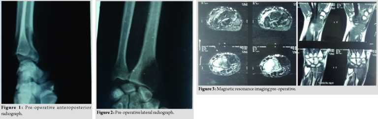 Pre-operative anteroposterior (AP) (Fig. 1) and lateral radiograph (Fig. 2) of the wrist were done which revealed an expanded osteolytic lesion at the epiphyseal region of the distal radius. Magnetic resonance imaging (MRI) (Fig. 3) and fine-needle aspiration cytology were done and GCT was diagnosed Campanacci Type 3. The patient was operated and treated by excision of tumor and reconstruction with contralateral fibular grafting with K-wire fixation of DER and biopsy of growth was sent. Above elbow slab was applied (Fig. 4 and 5).
