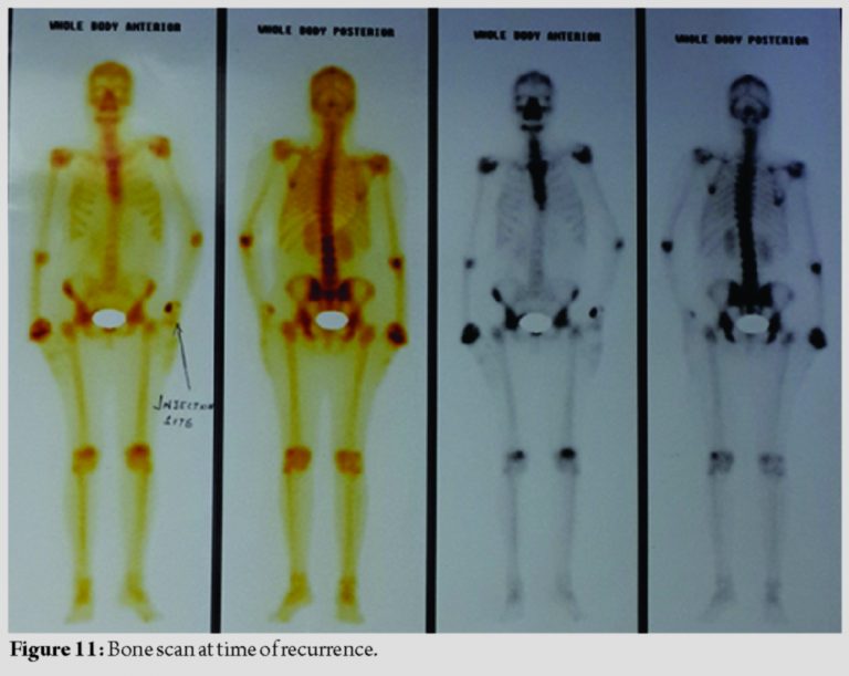 After 7 years, the patient again turned with a swelling at the same region, which is also gradually increasing in size for the past 3 months (Fig. 8) and was able to do daily routine household activities. X-ray AP and lateral views (Fig. 9) of wrist showed gross lytic expansion of the fibular graft with lytic lesions of the multiple proximal carpal bones. MRI of wrist(Fig. 10)shows expansile lytic lesion, with corticomedullary destruction. A radiological diagnosis of GCT Campanacci Grade 3 was made. Bone scan (Fig. 11) was done to rule out any metastasis and showed abnormal increased uptake seen in radiotherapy. She subsequently was managed by resection of tumor tissue by volar approach to DER with proximal row carpectomy with ulnocarpal fusion with retrograde K-wire fixation of the 3rd metacarpal resulting in centralization of ulna. Wound is closed without tension and above elbow pop slab is applied. Above elbow pop slab is applied for 12 weeks. Physiotherapy is commenced immediately after the surgery, starting with finger movements. Wrist physiotherapy is commenced at 12-week post-surgery after confirming union.