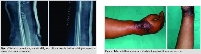 GCT of bone is locally aggressive in nature and is associated with high incidence of recurrence [2,3]. Selection of proper treatment is complicated due to the failure of its histologic appearance to indicate its biology [4,5]. The goal of treatment is to remove the tumor, decreasing the chances of recurrence [6], and preserve the joint function. Among different modalities of treatment available, simple curettage of giant cell tumor is associated with 5–15% rate of local [7], osteonecrosis with liquid nitrogen is associated with high risk of fracture. Intralesional curettage with packing of the defect with methylmethacrylate (bone cement) has become popular [8]. The free radicals and the thermal effects of the polymerization reaction can cause necrosis as much as 2 or 3 mms in the cancellous bone, with lack of donorsite morbidity, and elimination of the risk of transmission of disease associated with the use of allograft bone, immediate structural stability, and potential for earlier detection of local recurrence. This patient having Campanacci Grade 3 tumor recurred in the grafted fibula. This lesion is not amenable to curettage and adjuvant therapy. Hence, only option left is wide excision including carpals (scaphoid, lunate, trapezoid, and capitate) with reconstruction of the joint. The patient refused for fibular grafting, so wide excision with centralization of ulna[1,13,14,15,16,17] was done.