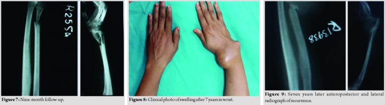 Case Report: A 40-year-old female was diagnosed with Campanacci Type 3 GCT-DER 7-year back. The patient was operated and treated by excision of tumor and reconstruction with contralateral fibular grafting with K-wire fixation of DER7-year back and biopsy of growth was sent. After 7 years, the patient again developed swelling over the right wrist and radiological diagnosis of GCT Campanacci Grade 3 is made. She is managed by resection of tumor tissue by volar approach to DER with proximal row carpectomy with ulnocarpal fusion with retrograde K-wire fixation of the 3rd metacarpal resulting in centralization of ulna.