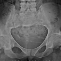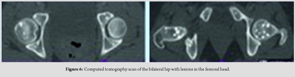 A 61-year-old unmarried male came with the complaints of right hip pain with the inability to bear weight on the right lower limb for 1 month. There was no history of trauma or other systemic symptoms. He had consulted the local practitioner, who advised an X-ray, which was reported as osteopoikilosis (spotted bone disease) by the radiologist. He was asked to take bed rest and analgesics but the pain persisted.