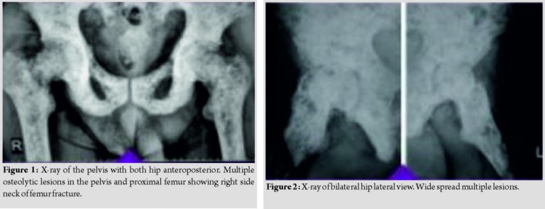 In view of multiple metastatic involvements, life expectancy of the patient was limited; hence, palliative treatment in the form of cemented bipolar hemiarthroplasty was done for better ambulation and pain relief. Unfortunately, the patient died of pulmonary sepsis after 2 months.